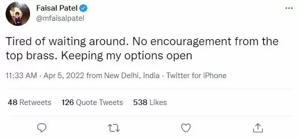 उन्होंने ट्वीट किया, ‘इंतजार करते हुए थक गया हूं। शीर्ष नेतृत्व से कोई उत्साह नहीं मिला। मेरे विकल्प खुले हुए हैं।’ मूल रूप से गुजरात से ताल्लुक रखने वाले फैसल पटेल ने राज्य विधानसभा चुनाव से कुछ महीने पहले यह टिप्पणी की है।