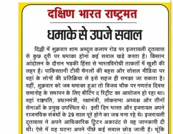 इसी दिन भारत और इजरायल अपने राजनयिक संबंधों के 29 साल पूरे होने का जश्न मना रहे थे। इजरायली दूतावास ने अपने आधिकारिक ट्विटर अकाउंट से यह जानकारी दी थी। ऐसे में यह घटना अपने पीछे कई सवाल छोड़ जाती है। चूंकि भारत की तरह ही इजरायल भी आतंकवाद से पीड़ित रहा है। भारत के साथ उसके मधुर संबंध हैं। आतंकी तत्व उसे नष्ट करने की धमकी देते रहते हैं परंतु इजरायल अपने शौर्य, पराक्रम व परिश्रम से कायम है और प्रगति भी कर रहा है। वह आतंकवाद के मामले में शून्य सहिष्णुता की नीति अपनाता है, इसलिए आतंकी उससे खौफ खाते हैं। यह धमाका स्वाभाविक रूप से सुरक्षा एजेंसियों के लिए जांच का विषय है। कहीं किसान आंदोलन की आड़ में राष्ट्र एवं शांतिविरोधी तत्व राजधानी में जड़ें जमाकर देश की संप्रभुता को चुनौती देने की कोशिश तो नहीं कर रहे? कहीं आतंकी तत्व इजरायली दूतावास को निशाना बनाने के लिए उपयुक्त अवसर की तलाश तो नहीं कर रहे?प्रधानमंत्री नरेंद्र मोदी के सत्ता में आने के बाद आतंकियों के खिलाफ देश का रुख और सख्त हुआ है। उरी और पुलवामा जैसे हमलों के जवाब में पाकिस्तान में घुसकर प्रहार किया गया, तो पूरा देश इस फैसले के पक्ष में खड़ा था। जम्मू-कश्मीर से अनुच्छेद-370 के प्रावधान निष्प्रभावी किए गए हों या आतंकियों का संहार कर उनके संगठनों की कमर तोड़ना; सरकार, खुफिया एजेंसियों और सशस्त्र बलों ने अच्छा काम किया है।