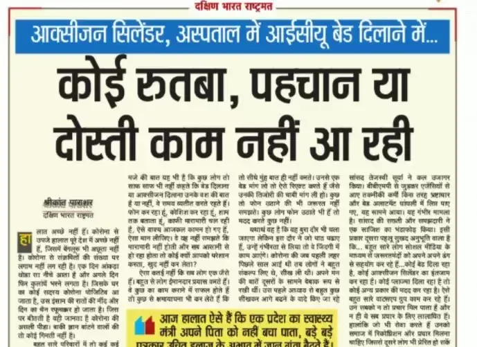 इस समय के दोनों पहलुओं पर गौर करना है। पहला, हमारे सिस्टम में बहुत धांधलियां हैं जिनमें से एक गंभीर मामला सांसद तेजस्वी सूर्या ने कल उजागर किया। बीबीएमपी से जुड़कर एजेंसियों से आए तकनीकी कर्मी किस तरह भ्रष्टाचार और बेड अलाटमेंट धांधली में लिप्त पाए गए, यह सामने आया। यह गंभीर मामला है। सांसद की सख्ती और समझदारी ने एक साजिश का भंडाफोड़ किया। इसी प्रकार दूसरा पहलू सुखद अनुभूति वाला है कि… बहुत सारे लोग सोशल मीडिया के माध्यम से जरूरतमंदों को अपने अपने ढंग से सहयोग कर रहे हैं…कोई बेड दिला रहा है, कोई आक्सीजन सिलेंडर का इंतजाम कर रहा है। कोई प्लाज्मा दिला रहा है तो कोई अन्य प्रकार की मदद कर रहा है। ऐसे बहुत सारे वाट्सएप ग्रुप काम कर रहे हैं। उन सबको न तो प्रचार मिल पाता है और न ही ये सब प्रचार के लिए लालायित हैं।