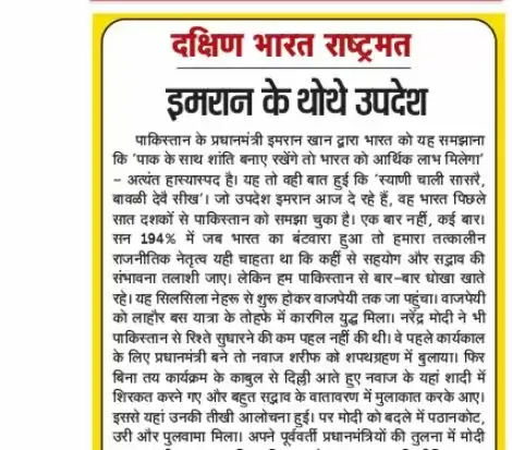 पाकिस्तान के प्रधानमंत्री इमरान खान द्वारा भारत को यह समझाना कि ‘पाक के साथ शांति बनाए रखेंगे तो भारत को आर्थिक लाभ मिलेगा’ – अत्यंत हास्यास्पद है। यह तो वही बात हुई कि ‘स्याणी चाली सासरै, बावळी देवै सीख’। जो उपदेश इमरान आज दे रहे हैं, वह भारत पिछले सात दशकों से पाकिस्तान को समझा चुका है। एक बार नहीं, कई बार।