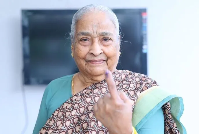 निर्वाचन आयोग ने 100 वर्ष की आयु की मतदाता कामुबेन पटेल की एक तस्वीर ट्वीट की जिसमें वह वलसाड जिले के उंबरगांव विधानसभा क्षेत्र के एक मतदान केंद्र में वोट डालने के बाद अपनी उंगली पर लगी स्याही को दिखा रही हैं।