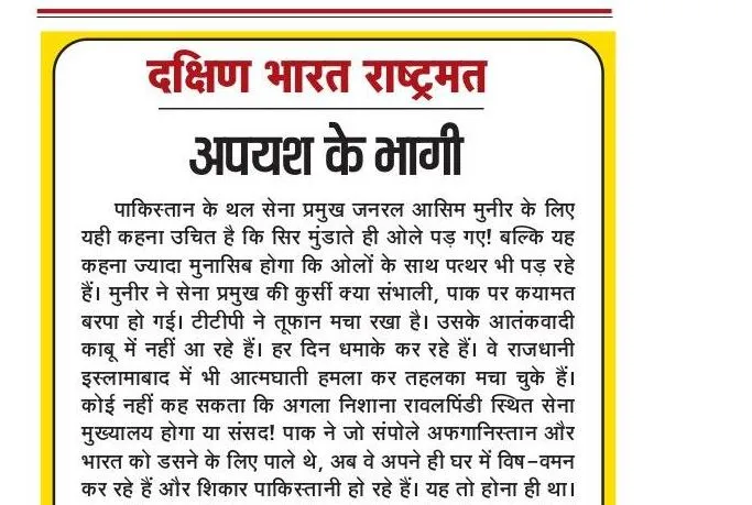 पाक ने जो संपोले अफगानिस्तान और भारत को डसने के लिए पाले थे, अब वे अपने ही घर में विष-वमन कर रहे हैं और शिकार पाकिस्तानी हो रहे हैं। यह तो होना ही था। पाक की ओर वही सबकुछ लौटकर आ रहा है, जो उसने दुनिया को दिया था। बेशक जनरल मुनीर अपने मुल्क के हालात देखकर फिक्रमंद होंगे, क्योंकि ऐसा कोई दिन नहीं जाता, जब वहां आतंकवादी हमला नहीं करते। इससे मुनीर की छवि को बट्टा लग रहा है। उनके पदग्रहण से पहले जो हवा बनाई गई थी, उन्हें बेहद सख्त प्रशासक कहा जा रहा था, वे सब बातें हवा-हवाई साबित हो रही हैं।