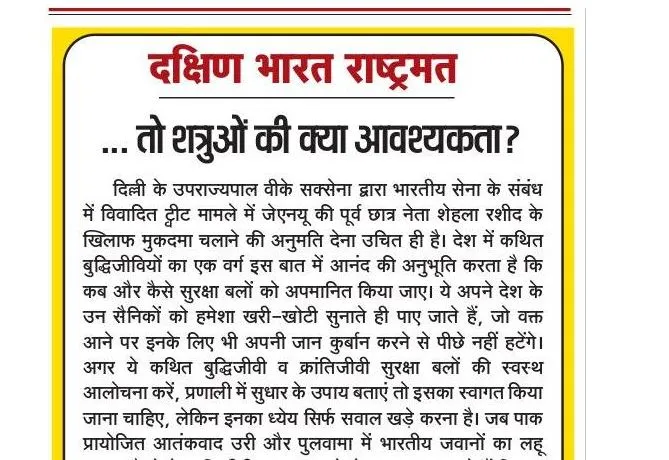दिल्ली के उपराज्यपाल वीके सक्सेना द्वारा भारतीय सेना के संबंध में विवादित ट्वीट मामले में जेएनयू की पूर्व छात्र नेता शेहला रशीद के खिलाफ मुकदमा चलाने की अनुमति देना उचित ही है। देश में कथित बुद्धिजीवियों का एक वर्ग इस बात में आनंद की अनुभूति करता है कि कब और कैसे सुरक्षा बलों को अपमानित किया जाए। ये अपने देश के उन सैनिकों को हमेशा खरी-खोटी सुनाते ही पाए जाते हैं, जो वक्त आने पर इनके लिए भी अपनी जान कुर्बान करने से पीछे नहीं हटेंगे।