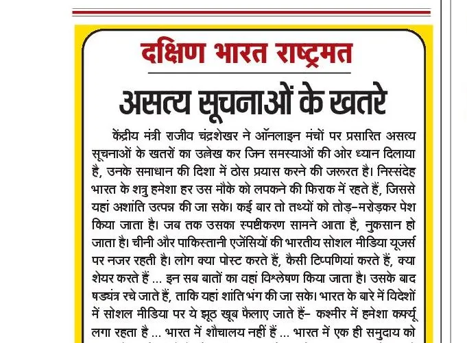 केंद्रीय मंत्री राजीव चंद्रशेखर ने ऑनलाइन मंचों पर प्रसारित असत्य सूचनाओं के खतरों का उल्लेख कर जिन समस्याओं की ओर ध्यान दिलाया है, उनके समाधान की दिशा में ठोस प्रयास करने की जरूरत है। निस्संदेह भारत के शत्रु हमेशा हर उस मौके को लपकने की फिराक में रहते हैं, जिससे यहां अशांति उत्पन्न की जा सके। कई बार तो तथ्यों को तोड़-मरोड़कर पेश किया जाता है। जब तक उसका स्पष्टीकरण सामने आता है, नुकसान हो जाता है।