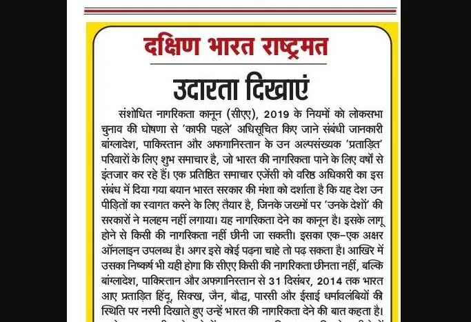 संशोधित नागरिकता कानून (सीएए), 2019 के नियमों को लोकसभा चुनाव की घोषणा से 'काफी पहले' अधिसूचित किए जाने संबंधी जानकारी बांग्लादेश, पाकिस्तान और अफगानिस्तान के उन अल्पसंख्यक 'प्रताड़ित' परिवारों के लिए शुभ समाचार है, जो भारत की नागरिकता पाने के लिए वर्षों से इंतजार कर रहे हैं। एक प्रतिष्ठित समाचार एजेंसी को वरिष्ठ अधिकारी का इस संबंध में दिया गया बयान भारत सरकार की मंशा को दर्शाता है कि यह देश उन पीड़ितों का स्वागत करने के लिए तैयार है, जिनके जख्मों पर 'उनके देशों' की सरकारों ने मलहम नहीं लगाया।