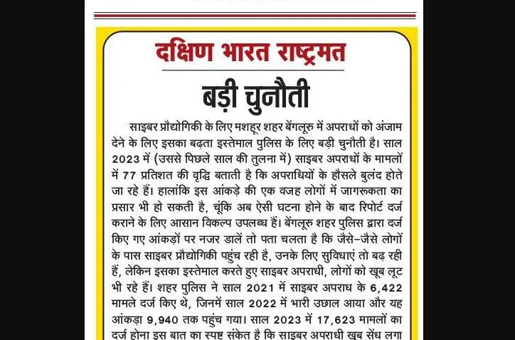 साइबर प्रौद्योगिकी के लिए मशहूर शहर बेंगलूरु में अपराधों को अंजाम देने के लिए इसका बढ़ता इस्तेमाल पुलिस के लिए बड़ी चुनौती है। साल 2023 में (उससे पिछले साल की तुलना में) साइबर अपराधों के मामलों में 77 प्रतिशत की वृद्धि बताती है कि अपराधियों के हौसले बुलंद होते जा रहे हैं। हालांकि इस आंकड़े की एक वजह लोगों में जागरूकता का प्रसार भी हो सकती है, चूंकि अब ऐसी घटना होने के बाद रिपोर्ट दर्ज कराने के लिए आसान विकल्प उपलब्ध हैं।