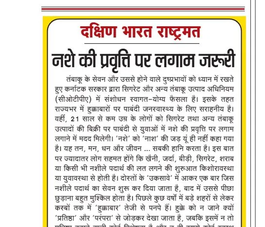 तंबाकू के सेवन और उससे होने वाले दुष्प्रभावों को ध्यान में रखते हुए कर्नाटक सरकार द्वारा सिगरेट और अन्य तंबाकू उत्पाद अधिनियम (सीओटीपीए) में संशोधन स्वागत-योग्य फैसला है। इसके तहत राज्यभर में हुक्काबारों पर पाबंदी जनस्वास्थ्य के लिए सराहनीय है। वहीं, 21 साल से कम उम्र के लोगों को सिगरेट तथा अन्य तंबाकू उत्पादों की बिक्री पर पाबंदी से युवाओं में नशे की प्रवृत्ति पर लगाम लगाने में मदद मिलेगी। 'नशे' को 'नाश' की जड़ यूं ही नहीं कहा गया है। यह तन, मन, धन और जीवन ... सबकी हानि करता है। इस बात पर ज्यादातर लोग सहमत होंगे कि खैनी, जर्दा, बीड़ी, सिगरेट, शराब या किसी भी नशीले पदार्थ की लत लगने की शुरुआत किशोरावस्था या युवावस्था से होती है। दोस्तों के 'उकसावे' में आकर एक बार जिस नशीले पदार्थ का सेवन शुरू कर दिया जाता है, बाद में उससे पीछा छुड़ाना बहुत मुश्किल होता है। पिछले कुछ वर्षों में बड़े शहरों से लेकर कस्बों तक में 'हुक्काबार' तेजी से पनपे हैं। हुक्के को न जाने क्यों 'प्रतिष्ठा' और 'परंपरा' से जोड़कर देखा जाता है, जबकि इसमें न तो प्रतिष्ठा बढ़ाने वाली कोई विशेषता है और न ही इससे कोई स्वस्थ परंपरा जुड़ी हुई है! इसे ऊंचे दर्जे की चीज समझना खुद को धोखे में डालने जैसा है। यह भी देखने में आया है कि हुक्काबार में मौज-मस्ती के नाम पर लोगों को अत्यंत मादक और हानिकारक पदार्थ परोसे जाते हैं। उनका धुआं फेफड़ों में लेने के बाद संबंधित व्यक्ति एक विचित्र किस्म की अनुभूति पाता है। इसे वह कुछ क्षणों का 'आनंद' समझता है, लेकिन असल में उस पदार्थ से उसके विवेक और चेतना का नाश होता है।