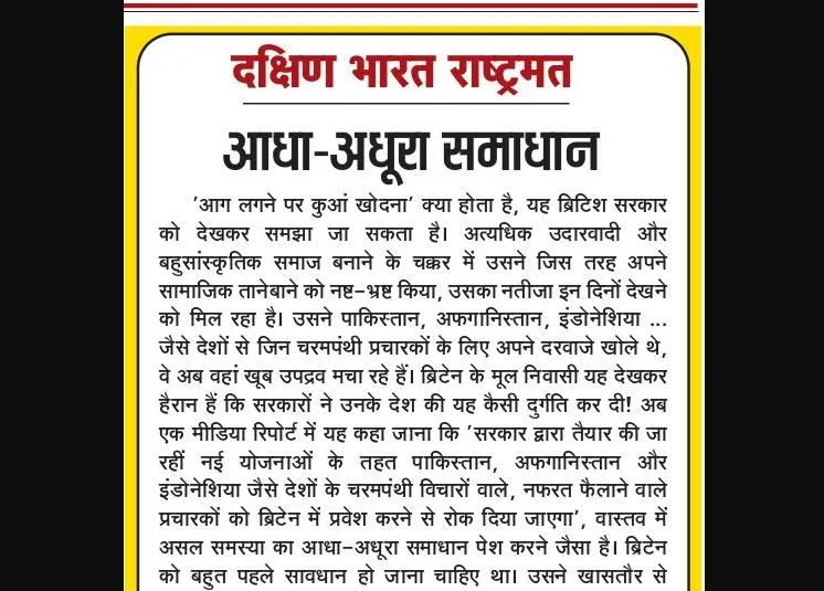 'आग लगने पर कुआं खोदना' क्या होता है, यह ब्रिटिश सरकार को देखकर समझा जा सकता है। अत्यधिक उदारवादी और बहुसांस्कृतिक समाज बनाने के चक्कर में उसने जिस तरह अपने सामाजिक तानेबाने को नष्ट-भ्रष्ट किया, उसका नतीजा इन दिनों देखने को मिल रहा है। उसने पाकिस्तान, अफगानिस्तान, इंडोनेशिया ... जैसे देशों से जिन चरमपंथी प्रचारकों के लिए अपने दरवाजे खोले थे, वे अब वहां खूब उपद्रव मचा रहे हैं। ब्रिटेन के मूल निवासी यह देखकर हैरान हैं कि सरकारों ने उनके देश की यह कैसी दुर्गति कर दी! अब एक मीडिया रिपोर्ट में यह कहा जाना कि 'सरकार द्वारा तैयार की जा रहीं नई योजनाओं के तहत पाकिस्तान, अफगानिस्तान और इंडोनेशिया जैसे देशों के चरमपंथी विचारों वाले, नफरत फैलाने वाले प्रचारकों को ब्रिटेन में प्रवेश करने से रोक दिया जाएगा', वास्तव में असल समस्या का आधा-अधूरा समाधान पेश करने जैसा है। ब्रिटेन को बहुत पहले सावधान हो जाना चाहिए था। उसने खासतौर से पाकिस्तान से आई एक बड़ी आबादी को नागरिकता देने में जिस तरह अति-उदारता दिखाई, वह उसे बहुत महंगी पड़ गई है। इससे वहां अपराध की दर बहुत ज्यादा बढ़ गई। सामाजिक सुरक्षा और अन्य सेवाओं पर दबाव बढ़ गया। कई इलाके तो ऐसे बन गए, जहां पुलिस भी जाने से कतराती है। सुएला ब्रेवरमैन को गृह मंत्री की कुर्सी इस वजह से गंवानी पड़ी थी, क्योंकि उन्होंने पाकिस्तानियों द्वारा ब्रिटेन में किए जा रहे गंभीर अपराधों का 'खुलासा' कर दिया था। आज वहां पाकिस्तानियों द्वारा ऐसे कई गिरोह चलाए जा रहे हैं, जो अंग्रेज लड़कियों को ड्रग्स की लत लगाकर उनसे दुष्कर्म करते हैं। लंदन, बर्मिंघम, लीसेस्टर समेत कई शहरों में ऐसे गिरोह काम कर रहे हैं, जिनमें पाक मूल के लोग बड़ी संख्या में शामिल हैं।