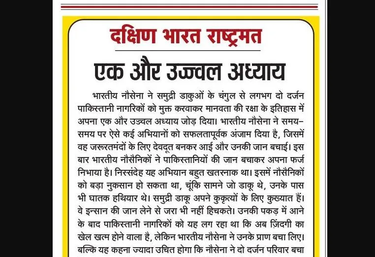 भारतीय नौसेना ने समुद्री डाकुओं के चंगुल से लगभग दो दर्जन पाकिस्तानी नागरिकों को मुक्त करवाकर मानवता की रक्षा के इतिहास में अपना एक और उज्ज्वल अध्याय जोड़ दिया। भारतीय नौसेना ने समय-समय पर ऐसे कई अभियानों को सफलतापूर्वक अंजाम दिया है, जिसमें वह जरूरतमंदों के लिए देवदूत बनकर आई और उनकी जान बचाई। इस बार भारतीय नौसैनिकों ने पाकिस्तानियों की जान बचाकर अपना फर्ज निभाया है। निस्संदेह यह अभियान बहुत खतरनाक था। इसमें नौसैनिकों को बड़ा नुकसान हो सकता था, चूंकि सामने जो डाकू थे, उनके पास भी घातक हथियार थे। समुद्री डाकू अपने कुकृत्यों के लिए कुख्यात हैं। वे इन्सान की जान लेने से जरा भी नहीं हिचकते। उनकी पकड़ में आने के बाद पाकिस्तानी नागरिकों को यह लग रहा था कि अब ज़िंदगी का खेल खत्म होने वाला है, लेकिन भारतीय नौसेना ने उनके प्राण बचा लिए। बल्कि यह कहना ज्यादा उचित होगा कि नौसेना ने दो दर्जन परिवार बचा लिए। अगर समुद्री डाकू इन पाकिस्तानियों की ज़िंदगी को नुकसान पहुंचा देते तो इन लोगों के परिवारों के लिए भी यह भारी दु:खदायक घटना होती। उक्त पाकिस्तानी नागरिकों ने भारतीय नौसेना का आभार जताया, उसके समर्थन में नारे भी लगाए। जब यह खबर उनके देश पहुंची तो पाकिस्तानी मीडिया इस पर टिप्पणी करने और आभार मानने से कन्नी काटता नजर आया। अगर कोई व्यक्ति/संगठन/सरकार किसी की जान बचाए तो उसका आभार मानना चाहिए, लेकिन 'नाशुक्रा' होना पाकिस्तानियों की पुरानी आदत है।