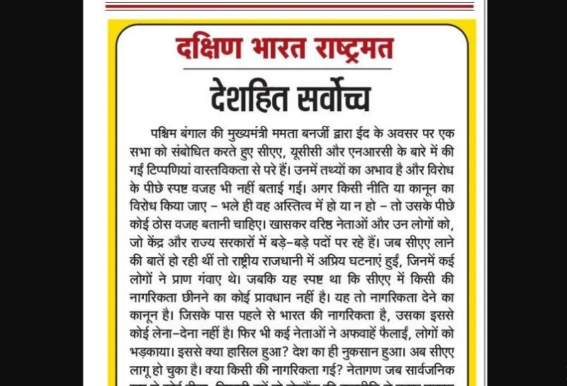 पश्चिम बंगाल की मुख्यमंत्री ममता बनर्जी द्वारा ईद के अवसर पर एक सभा को संबोधित करते हुए सीएए, यूसीसी और एनआरसी के बारे में की गईं टिप्पणियां वास्तविकता से परे हैं। उनमें तथ्यों का अभाव है और विरोध के पीछे स्पष्ट वजह भी नहीं बताई गई। अगर किसी नीति या कानून का विरोध किया जाए - भले ही वह अस्तित्व में हो या न हो - तो उसके पीछे कोई ठोस वजह बतानी चाहिए। खासकर वरिष्ठ नेताओं और उन लोगों को, जो केंद्र और राज्य सरकारों में बड़े-बड़े पदों पर रहे हैं। जब सीएए लाने की बातें हो रही थीं तो राष्ट्रीय राजधानी में अप्रिय घटनाएं हुईं, जिनमें कई लोगों ने प्राण गंवाए थे। जबकि यह स्पष्ट था कि सीएए में किसी की नागरिकता छीनने का कोई प्रावधान नहीं है। यह तो नागरिकता देने का कानून है। जिसके पास पहले से भारत की नागरिकता है, उसका इससे कोई लेना-देना नहीं है। फिर भी कई नेताओं ने अफवाहें फैलाईं, लोगों को भड़काया। इससे क्या हासिल हुआ? देश का ही नुकसान हुआ। अब सीएए लागू हो चुका है। क्या किसी की नागरिकता गई? नेतागण जब सार्वजनिक रूप से कोई टीका-टिप्पणी करें तो वोटबैंक की राजनीति से ऊपर उठकर उन्हें देशहित के बारे में भी सोचना चाहिए। इस बात का ध्यान रखना चाहिए कि कहीं मेरे शब्दों से देश के सद्भाव पर तो कोई नकारात्मक प्रभाव नहीं पड़ेगा, देशहित पर तो कोई आंच नहीं आएगी, लोगों तक ग़लत सूचना तो नहीं जाएगी? सीएए की ज़रूरत क्यों पड़ी? यह जानने के लिए नेतागण को कम से कम एक बार उन हिंदू, सिक्ख, ईसाई, बौद्ध, जैन और पारसियों से मिलना चाहिए, जिन्होंने अफगानिस्तान, पाकिस्तान और बांग्लादेश से अपनी जान बचाकर भारत में शरण ली है। उनकी दास्तां सुनकर रोंगटे खड़े हो जाते हैं।