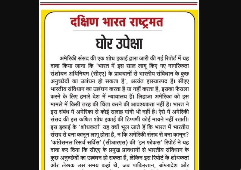 अमेरिकी संसद की एक शोध इकाई द्वारा जारी की गई रिपोर्ट में यह दावा किया जाना कि 'भारत में इस साल लागू किए गए नागरिकता संशोधन अधिनियम (सीएए) के प्रावधानों से भारतीय संविधान के कुछ अनुच्छेदों का उल्लंघन हो सकता है', अत्यंत हास्यास्पद है। सीएए भारतीय संविधान का उल्लंघन करता है या नहीं करता है, इसका फैसला करने के लिए हमारे देश में न्यायालय हैं। लिहाजा अमेरिका को इस मामले में किसी तरह की चिंता करने की आवश्यकता नहीं है। भारत ने इस संबंध में अमेरिका से कोई सलाह मांगी भी नहीं है। ऐसे में अमेरिकी संसद की इस कथित शोध इकाई की टिप्पणी कोई मायने नहीं रखती। इस इकाई के 'शोधकर्ता' यह क्यों भूल जाते हैं कि भारत में भारतीय संसद से बना कानून लागू होता है, न कि अमेरिकी संसद से बना कानून? 'कांग्रेसनल रिसर्च सर्विस' (सीआरएस) की 'इन फोकस' रिपोर्ट ने यह दावा कर दिया कि सीएए के प्रमुख प्रावधानों से भारतीय संविधान के कुछ अनुच्छेदों का उल्लंघन हो सकता है, लेकिन इस रिपोर्ट के शोधकर्ता और लेखक उस समय कहां थे, जब पाकिस्तान, बांग्लादेश और अफगानिस्तान में अल्पसंख्यकों पर अत्याचार हो रहे थे? वहां अब भी अत्याचार हो रहे हैं। क्या सीआरएस के शोधकर्ता ऐसी रिपोर्ट जारी करते हुए उक्त तीनों देशों की सरकारों को सलाह देने का साहस दिखाएंगे? पश्चिमी देशों के कथित थिंक टैंकों और शोध इकाइयों के साथ बड़ी समस्या यह है कि वे दूसरों को कोरे उपदेश देने में माहिर हैं। वे अपने देशों की सरकारों को ठोस सुझाव देकर उनका पालन करवाने में समर्थ नहीं हैं। अगर सीआरएस को लगता है कि भारत में सीएए लागू होने से कानून का उल्लंघन हो रहा है और यह समानता के सिद्धांतों के अनुकूल नहीं है तो उसे चाहिए कि वह अपने देश की सरकार को सुझाव दे कि पाकिस्तान, बांग्लादेश और अफगानिस्तान के पीड़ित व प्रताड़ित अल्पसंख्यकों के लिए अपने दरवाजे खोल दे।