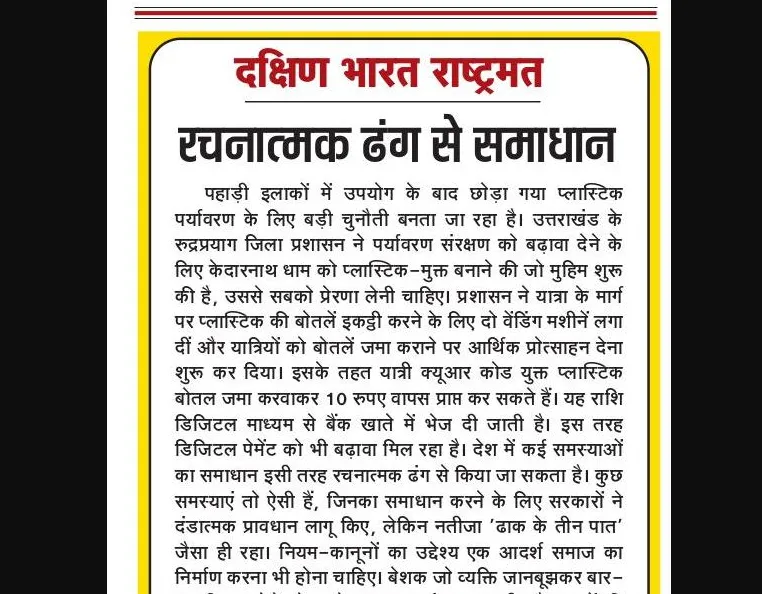 पहाड़ी इलाकों में उपयोग के बाद छोड़ा गया प्लास्टिक पर्यावरण के लिए बड़ी चुनौती बनता जा रहा है। उत्तराखंड के रुद्रप्रयाग जिला प्रशासन ने पर्यावरण संरक्षण को बढ़ावा देने के लिए केदारनाथ धाम को प्लास्टिक-मुक्त बनाने की जो मुहिम शुरू की है, उससे सबको प्रेरणा लेनी चाहिए। प्रशासन ने यात्रा के मार्ग पर प्लास्टिक की बोतलें इकट्ठी करने के लिए दो वेंडिंग मशीनें लगा दीं और यात्रियों को बोतलें जमा कराने पर आर्थिक प्रोत्साहन देना शुरू कर दिया। इसके तहत यात्री क्यूआर कोड युक्त प्लास्टिक बोतल जमा करवाकर 10 रुपए वापस प्राप्त कर सकते हैं। यह राशि डिजिटल माध्यम से बैंक खाते में भेज दी जाती है। इस तरह डिजिटल पेमेंट को भी बढ़ावा मिल रहा है। देश में कई समस्याओं का समाधान इसी तरह रचनात्मक ढंग से किया जा सकता है। कुछ समस्याएं तो ऐसी हैं, जिनका समाधान करने के लिए सरकारों ने दंडात्मक प्रावधान लागू किए, लेकिन नतीजा 'ढाक के तीन पात' जैसा ही रहा। नियम-कानूनों का उद्देश्य एक आदर्श समाज का निर्माण करना भी होना चाहिए। बेशक जो व्यक्ति जानबूझकर बार-बार नियम तोड़े, देश को नुकसान पहुंचाए, अपनी और दूसरों की जान जोखिम में डाले, उसके साथ सख्ती बरतनी ही होगी, लेकिन जो व्यक्ति नियमों का पालन करे, जिसकी मंशा किसी को नुकसान पहुंचाने की न हो, जो देश के उत्थान में योगदान देना चाहे, उसे प्रोत्साहन मिलना ही चाहिए। यह अपने नागरिकों में किया गया एक तरह का निवेश है, जो कई तरह के फायदों के रूप में लौटकर जरूर आएगा।