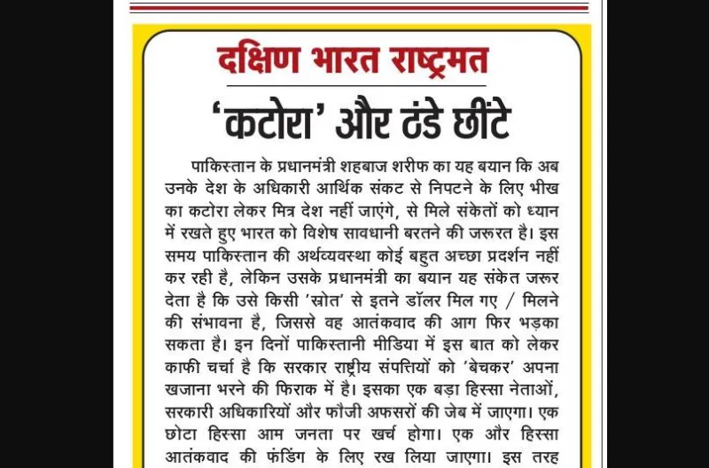 पाकिस्तान के प्रधानमंत्री शहबाज शरीफ का यह बयान कि अब उनके देश के अधिकारी आर्थिक संकट से निपटने के लिए भीख का कटोरा लेकर मित्र देश नहीं जाएंगे, से मिले संकेतों को ध्यान में रखते हुए भारत को विशेष सावधानी बरतने की जरूरत है। इस समय पाकिस्तान की अर्थव्यवस्था कोई बहुत अच्छा प्रदर्शन नहीं कर रही है, लेकिन उसके प्रधानमंत्री का बयान यह संकेत जरूर देता है कि उसे किसी 'स्रोत' से इतने डॉलर मिल गए / मिलने की संभावना है, जिससे वह आतंकवाद की आग फिर भड़का सकता है। इन दिनों पाकिस्तानी मीडिया में इस बात को लेकर काफी चर्चा है कि सरकार राष्ट्रीय संपत्तियों को 'बेचकर' अपना खजाना भरने की फिराक में है। इसका एक बड़ा हिस्सा नेताओं, सरकारी अधिकारियों और फौजी अफसरों की जेब में जाएगा। एक छोटा हिस्सा आम जनता पर खर्च होगा। एक और हिस्सा आतंकवाद की फंडिंग के लिए रख लिया जाएगा। इस तरह पाकिस्तान के खजाने में आया एक-एक डॉलर शांति के लिए खतरा है। पाकिस्तान में पिछले लगभग दो दशकों में 'कश्कोल' शब्द चर्चा में रहा है। इसका अर्थ होता है- भीख मांगने का कटोरा। पूर्व प्रधानमंत्री इमरान खान ने इसे बहुत मशहूर कर दिया था। वे कहते थे कि यह 'कश्कोल' मैं तोड़ूंगा। उनके सत्ता में आने के बाद पाकिस्तान का कश्कोल तो नहीं टूटा, अलबत्ता उसका आकार और बड़ा हो गया, ताकि उसमें ज्यादा संख्या में 'माल' आ सके। संयुक्त अरब अमीरात के राष्ट्रपति मोहम्मद बिन जायद अल नाह्यान को संबोधित करते हुए शहबाज का यह कहना कि 'मेरे प्यारे भाई, आपने अपने महान पिता की तरह, एक भाई की तरह, परिवार के सदस्य की तरह पाकिस्तान का समर्थन किया', को भी समझने की जरूरत है।