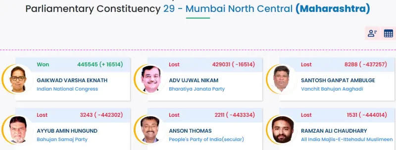 उज्ज्वल निकम को 429031 वोट मिले और वे दूसरे स्थान पर रहे। उन्हें कांग्रेस उम्मीदवार वर्षा एकनाथ गायकवाड़ के सामने शिकस्त का सामना करना पड़ा। वर्षा को 445545 वोट मिले। इस तरह 16514 वोटों के अंतर से यह सीट कांग्रेस के खाते में चली गई।