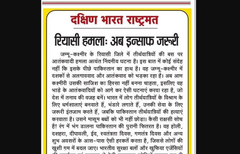 जम्मू-कश्मीर के रियासी जिले में तीर्थयात्रियों की बस पर आतंकवादी हमला अत्यंत निंदनीय घटना है। इस बात में कोई संदेह नहीं कि इसके पीछे पाकिस्तान का हाथ है। वह जम्मू-कश्मीर में दशकों से अलगाववाद और आतंकवाद को भड़का रहा है। अब आम कश्मीरी उसकी साजिश का हिस्सा नहीं बनना चाहता, इसलिए वह भाड़े के आतंकवादियों को आगे कर ऐसी घटनाएं करवा रहा है, जो देश में तनाव की वजह बनें। भारत में लोग तीर्थयात्रियों के विश्राम के लिए धर्मशालाएं बनवाते हैं, भंडारे लगाते हैं, उनकी सेवा के लिए जरूरी इंतजाम करते हैं, जबकि पाकिस्तान तीर्थयात्रियों की हत्याएं करवाता है। उसने मासूम बच्चों को भी नहीं छोड़ा। कैसी राक्षसी सोच है! रंग में भंग डालना पाकिस्तान की पुरानी फितरत है। वह होली, दशहरा, दीपावली, ईद, स्वतंत्रता दिवस, गणतंत्र दिवस और अन्य शुभ अवसरों के आस-पास ऐसी हरकतें करता है, जिससे लोगों की खुशी ग़म में बदल जाए। भारतीय सुरक्षा बलों और खुफिया एजेंसियों की सतर्कता एवं सूझबूझ से ऐसी ज्यादातर कोशिशें नाकाम कर दी जाती हैं। आम जनता को तो उनके बारे में पता ही नहीं चलता। कभी-कभी किसी कारणवश आतंकवादियों के नापाक मंसूबे काम कर जाते हैं। तब हमें नुकसान होता है। वास्तव में आतंकवादियों को ऐसे ही एक मौके की जरूरत होती है। जब रियासी में हमला हुआ तो आतंकवादी जानते थे कि दिल्ली में देश की नई सरकार का शपथग्रहण समारोह हो रहा है। उस दिन हमले का मतलब है- रंग में भंग डालने की कोशिश करना, देश को चुनौती देना, प्रचार पाने का एक घिनौना तरीका अपनाना।