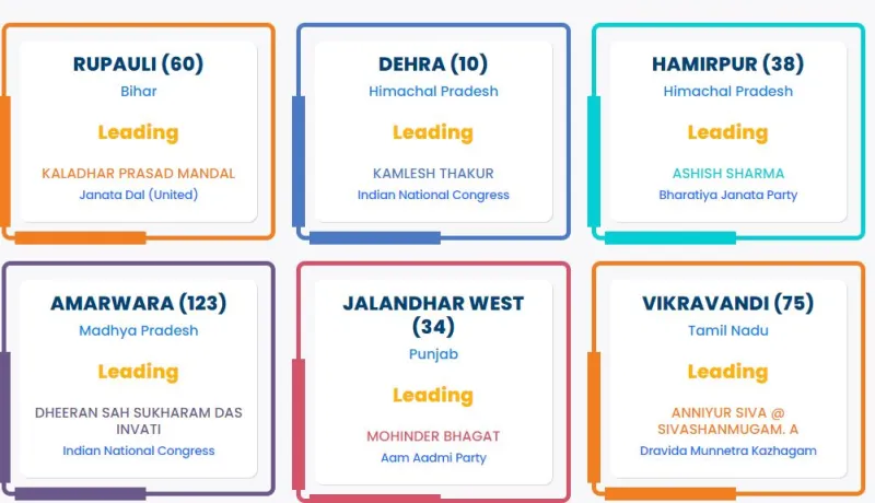 नई दिल्ली/दक्षिण भारत। कांग्रेस, आप, तृणकां और द्रमुक जैसे इंडि गठबंधन दलों के उम्मीदवार शनिवार को 13 विधानसभा सीटों में से 11 पर आगे चल रहे हैं, जहां इस सप्ताह के शुरू में उपचुनाव हुए थे। चुनाव आयोग की वेबसाइट पर मतगणना के रुझान आ रहे हैं।