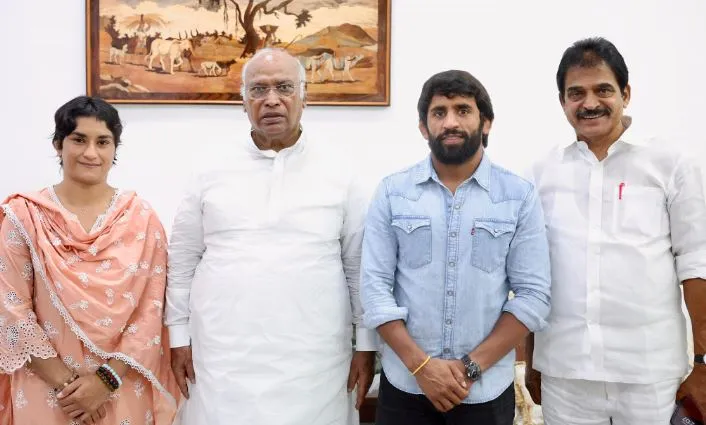 फोगाट और पूनिया ने खरगे और कांग्रेस के अन्य वरिष्ठ नेताओं से 10 राजाजी मार्ग स्थित उनके आवास पर मुलाकात की। वे कांग्रेस मुख्यालय में एक संवाददाता सम्मेलन में आधिकारिक रूप से पार्टी में शामिल हो सकते हैं।