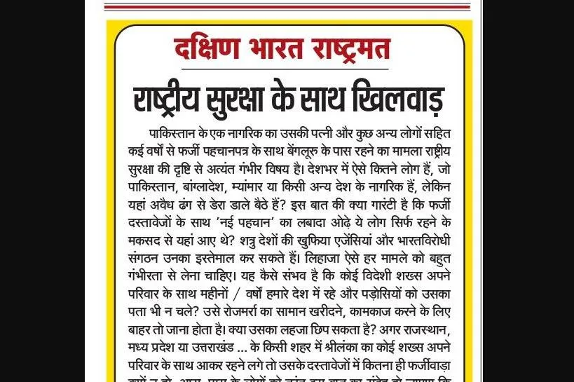 पाकिस्तान के एक नागरिक का उसकी पत्नी और कुछ अन्य लोगों सहित कई वर्षों से फर्जी पहचानपत्र के साथ बेंगलूरु के पास रहने का मामला राष्ट्रीय सुरक्षा की दृष्टि से अत्यंत गंभीर विषय है। देशभर में ऐसे कितने लोग हैं, जो पाकिस्तान, बांग्लादेश, म्यांमार या किसी अन्य देश के नागरिक हैं, लेकिन यहां अवैध ढंग से डेरा डाले बैठे हैं?