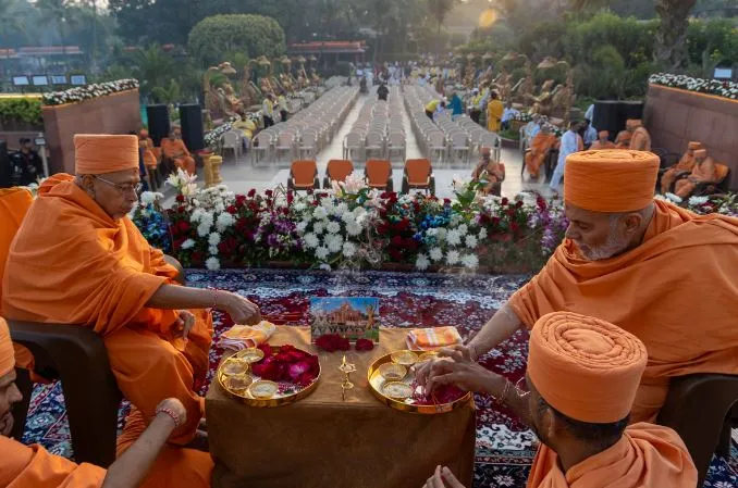 बताया गया कि लगभग तीन दशक पहले, प्रमुख स्वामी महाराज ने गांधीनगर में अक्षरधाम मंदिर का निर्माण कराया था। यहां महंत स्वामी महाराज के दिशा-निर्देशों के अनुसार भव्य समारोह में प्रतिमा की प्राण-प्रतिष्ठा के दौरान अद्भुत वातावरण था। श्रद्धालुओं ने संतों की उपस्थिति में धर्म एवं संस्कृति के बारे में ज्ञान प्राप्त किया।