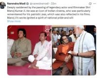 मनोज कुमार के निधन पर प्रधानमंत्री नरेंद्र मोदी ने शोक जताया है। उन्होंने अपने एक्स अकाउंट पर लिखा, 'महान अभिनेता और फ़िल्मकार मनोज कुमारजी के निधन से बहुत दुःख हुआ। वे भारतीय सिनेमा के प्रतीक थे, जिन्हें ख़ास तौर पर उनकी देशभक्ति के जोश के लिए याद किया जाता था, जो उनकी फ़िल्मों में भी झलकता था।'उन्होंने कहा, 'मनोजजी के कामों ने राष्ट्रीय गौरव की भावना को जगाया और वे पीढ़ियों को प्रेरित करते रहेंगे। इस दु:ख की घड़ी में मेरी संवेदनाएं उनके परिवार और प्रशंसकों के साथ हैं। ऊँ शांति।'