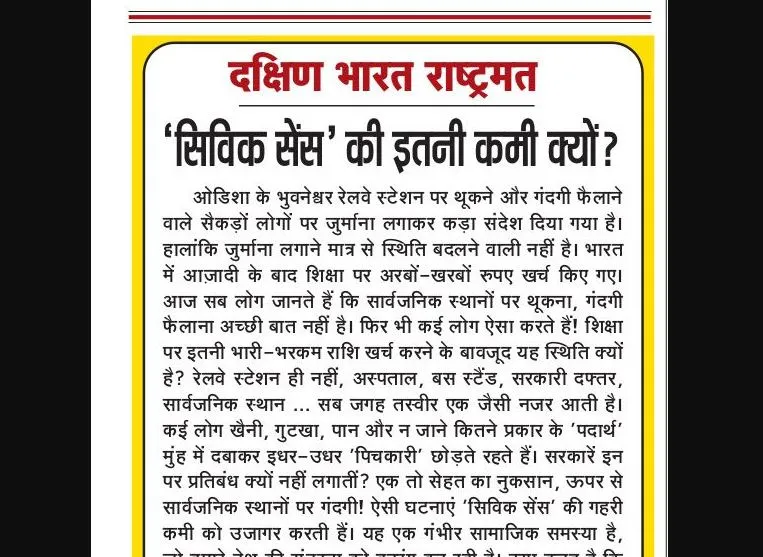 ओडिशा के भुवनेश्वर रेलवे स्टेशन पर थूकने और गंदगी फैलाने वाले सैकड़ों लोगों पर जुर्माना लगाकर कड़ा संदेश दिया गया है। हालांकि जुर्माना लगाने मात्र से स्थिति बदलने वाली नहीं है। भारत में आज़ादी के बाद शिक्षा पर अरबों-खरबों रुपए खर्च किए गए। आज सब लोग जानते हैं कि सार्वजनिक स्थानों पर थूकना, गंदगी फैलाना अच्छी बात नहीं है। फिर भी कई लोग ऐसा करते हैं! शिक्षा पर इतनी भारी-भरकम राशि खर्च करने के बावजूद यह स्थिति क्यों है? रेलवे स्टेशन ही नहीं, अस्पताल, बस स्टैंड, सरकारी दफ्तर, सार्वजनिक स्थान ... सब जगह तस्वीर एक जैसी नजर आती है। कई लोग खैनी, गुटखा, पान और न जाने कितने प्रकार के 'पदार्थ' मुंह में दबाकर इधर-उधर 'पिचकारी' छोड़ते रहते हैं। सरकारें इन पर प्रतिबंध क्यों नहीं लगातीं? एक तो सेहत का नुकसान, ऊपर से सार्वजनिक स्थानों पर गंदगी! ऐसी घटनाएं 'सिविक सेंस' की गहरी कमी को उजागर करती हैं। यह एक गंभीर सामाजिक समस्या है, जो हमारे देश की सुंदरता को बदरंग कर रही है। क्या वजह है कि जब हम न्यूयॉर्क, लंदन या टोक्यो जैसे शहरों के रेलवे स्टेशनों पर जाते हैं तो वहां बहुत अनुशासित होते हैं, नियमों का पूरा-पूरा पालन करते हैं, कतार में खड़े होते हैं, गंदगी फैलाने का तो ख़याल भी मन में नहीं आता है, लेकिन जैसे ही अपने देश के किसी रेलवे स्टेशन पहुंचते हैं तो नियमों का पालन करने में ढिलाई बरतने लगते हैं? नियमों का उल्लंघन सब लोग नहीं करते, लेकिन बहुत लोग करते हैं। वे गंदगी फैलाते हैं। जब कोई उन्हें टोकता है तो वे झगड़ा करने लगते हैं। यह दलील देते हैं कि अकेला मैं ही नहीं फैला रहा, 'उस व्यक्ति' को रोको!