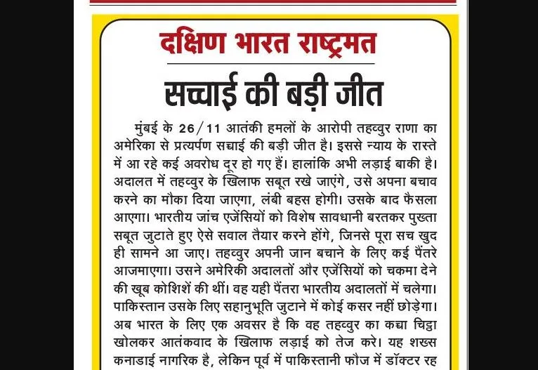 मुंबई के 26/11 आतंकी हमलों के आरोपी तहव्वुर राणा का अमेरिका से प्रत्यर्पण सच्चाई की बड़ी जीत है। इससे न्याय के रास्ते में आ रहे कई अवरोध दूर हो गए हैं। हालांकि अभी लड़ाई बाकी है। अदालत में तहव्वुर के खिलाफ सबूत रखे जाएंगे, उसे अपना बचाव करने का मौका दिया जाएगा, लंबी बहस होगी। उसके बाद फैसला आएगा। भारतीय जांच एजेंसियों को विशेष सावधानी बरतकर पुख्ता सबूत जुटाते हुए ऐसे सवाल तैयार करने होंगे, जिनसे पूरा सच खुद ही सामने आ जाए। तहव्वुर अपनी जान बचाने के लिए कई पैंतरे आजमाएगा। उसने अमेरिकी अदालतों और एजेंसियों को चकमा देने की खूब कोशिशें की थीं। वह यही पैंतरा भारतीय अदालतों में चलेगा। पाकिस्तान उसके लिए सहानुभूति जुटाने में कोई कसर नहीं छोड़ेगा। अब भारत के लिए एक अवसर है कि वह तहव्वुर का कच्चा चिट्ठा खोलकर आतंकवाद के खिलाफ लड़ाई को तेज करे। यह शख्स कनाडाई नागरिक है, लेकिन पूर्व में पाकिस्तानी फौज में डॉक्टर रह चुका है। इसने डेविड कोलमैन हेडली का भरपूर सहयोग किया था, जिसने मुंबई हमलों से पहले रेकी कर साजिश रची थी। तहव्वुर ने उसे जिस तरह वीजा लगवाने और फर्जी पहचान बनाकर मुंबई में अत्यंत महत्त्वपूर्ण जगहों की जानकारी जुटाने के लिए 'पर्दे के पीछे' से दिशा-निर्देश दिए थे, उससे स्पष्ट होता है कि यह कसाब से भी ज्यादा खतरनाक आतंकवादी है। अगर इसे भविष्य में सख्त सजा होती है तो उन सभी आतंकवादियों और उनके आकाओं तक कड़ा संदेश जाएगा, जो इस भ्रम में रहते हैं कि उनका कोई कुछ नहीं बिगाड़ सकता।