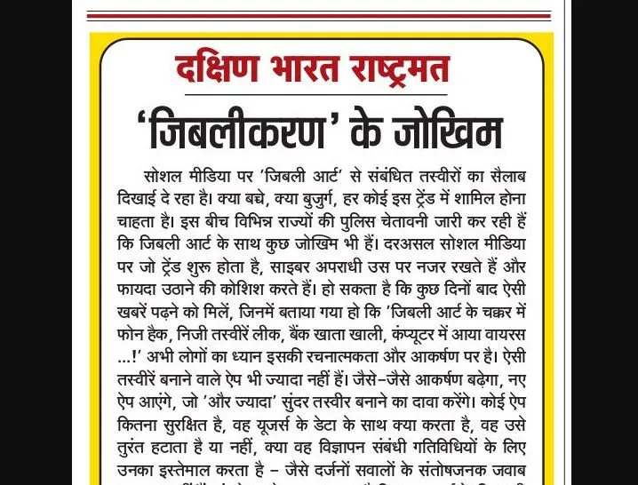 सोशल मीडिया पर 'जिबली आर्ट' से संबंधित तस्वीरों का सैलाब दिखाई दे रहा है। क्या बच्चे, क्या बुजुर्ग, हर कोई इस ट्रेंड में शामिल होना चाहता है। इस बीच विभिन्न राज्यों की पुलिस चेतावनी जारी कर रही हैं कि जिबली आर्ट के साथ कुछ जोखिम भी हैं। दरअसल सोशल मीडिया पर जो ट्रेंड शुरू होता है, साइबर अपराधी उस पर नजर रखते हैं और फायदा उठाने की कोशिश करते हैं। हो सकता है कि कुछ दिनों बाद ऐसी खबरें पढ़ने को मिलें, जिनमें बताया गया हो कि 'जिबली आर्ट के चक्कर में फोन हैक, निजी तस्वीरें लीक, बैंक खाता खाली, कंप्यूटर में आया वायरस ...!' अभी लोगों का ध्यान इसकी रचनात्मकता और आकर्षण पर है। ऐसी तस्वीरें बनाने वाले ऐप भी ज्यादा नहीं हैं। जैसे-जैसे आकर्षण बढ़ेगा, नए ऐप आएंगे, जो 'और ज्यादा' सुंदर तस्वीर बनाने का दावा करेंगे। कोई ऐप कितना सुरक्षित है, वह यूजर्स के डेटा के साथ क्या करता है, वह उसे तुरंत हटाता है या नहीं, क्या वह विज्ञापन संबंधी गतिविधियों के लिए उनका इस्तेमाल करता है - जैसे दर्जनों सवालों के संतोषजनक जवाब उपलब्ध नहीं हैं। यूं तो हर ऐप दावा करता है कि वह यूजर्स के लिए पूरी तरह सुरक्षित है, लेकिन पूर्व में भारत सरकार ने ऐसे दर्जनों ऐप्स पर पाबंदी लगाई थी, जो निजता और राष्ट्रीय सुरक्षा के लिए खतरा थे। चीनी कंपनियां ऐसे ऐप बनाने और उनका प्रचार करने में आगे रहती हैं। उन पर यूजर्स के डेटा को चीनी खुफिया एजेंसियों के साथ साझा करने के आरोप लग चुके हैं। ऐसे में अपनी तस्वीरों के 'जिबलीकरण' के लिए किसी ऐप को डेटा सौंप देना कितना सुरक्षित है?