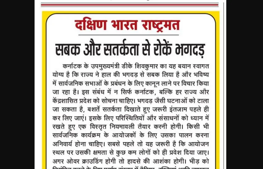 कर्नाटक के उपमुख्यमंत्री डीके शिवकुमार का यह बयान स्वागत योग्य है कि राज्य ने हाल की भगदड़ से सबक लिया है और भविष्य में सार्वजनिक सभाओं के प्रबंधन के लिए कानून लाने पर विचार किया जा रहा है। इस संबंध में न सिर्फ कर्नाटक, बल्कि हर राज्य और केंद्रशासित प्रदेश को सोचना चाहिए। भगदड़ जैसी घटनाओं को टाला जा सकता है, बशर्ते सतर्कता दिखाते हुए जरूरी इंतजाम पहले ही कर लिए जाएं। इसके लिए परिस्थितियों और संसाधनों को ध्यान में रखते हुए एक विस्तृत नियमावली तैयार करनी होगी। किसी भी सार्वजनिक कार्यक्रम के आयोजकों के लिए उसका पालन करना अनिवार्य होना चाहिए। सबसे पहले तो यह जरूरी है कि आयोजन स्थल पर उसकी क्षमता से कुछ कम लोगों को ही प्रवेश दिया जाए। अगर ओवर क्राउडिंग होगी तो हादसे की आशंका होगी। भीड़ को नियंत्रित करने के लिए पर्याप्त संख्या में बैरियर, रस्सियां आदि लगाकर अलग-अलग कतारें बनाना बेहतर होता है। प्रवेश और निकास के लिए पर्याप्त संख्या में द्वार होने चाहिएं। कई जगह इस वजह से धक्कामुक्की की घटनाएं हो जाती हैं, क्योंकि द्वार बहुत संकरे और कम संख्या में थे। आयोजन स्थल पर प्रशिक्षित सुरक्षाकर्मियों को तैनात करने से भीड़ नियंत्रण में सहायता मिलती है, लेकिन कार्यक्रम की योजना बनाते समय जोखिम का आकलन जरूर करना चाहिए। रास्ते संकरे हैं या चौड़े, आस-पास बिजली के तार तो नहीं हैं, कोई कुआं, गड्ढा या तालाब तो नहीं है, क्या रेलवे की पटरियां नजदीक हैं, क्या वहां ज्वलनशील सामग्री मौजूद है ... जैसे जोखिमों का पहले ही आकलन कर लेना चाहिए।