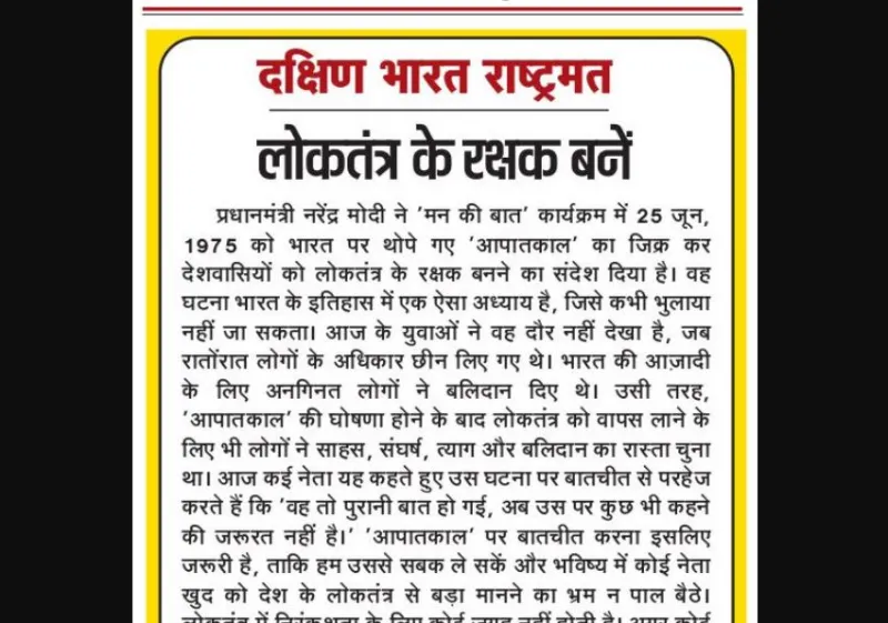 प्रधानमंत्री नरेंद्र मोदी ने 'मन की बात' कार्यक्रम में 25 जून, 1975 को भारत पर थोपे गए 'आपातकाल' का जिक्र कर देशवासियों को लोकतंत्र के रक्षक बनने का संदेश दिया है। वह घटना भारत के इतिहास में एक ऐसा अध्याय है, जिसे कभी भुलाया नहीं जा सकता। आज के युवाओं ने वह दौर नहीं देखा है, जब रातोंरात लोगों के अधिकार छीन लिए गए थे। भारत की आज़ादी के लिए अनगिनत लोगों ने बलिदान दिए थे। उसी तरह, 'आपातकाल' की घोषणा होने के बाद लोकतंत्र को वापस लाने के लिए भी लोगों ने साहस, संघर्ष, त्याग और बलिदान का रास्ता चुना था। आज कई नेता यह कहते हुए उस घटना पर बातचीत से परहेज करते हैं कि 'वह तो पुरानी बात हो गई, अब उस पर कुछ भी कहने की जरूरत नहीं है।' 'आपातकाल' पर बातचीत करना इसलिए जरूरी है, ताकि हम उससे सबक ले सकें और भविष्य में कोई नेता खुद को देश के लोकतंत्र से बड़ा मानने का भ्रम न पाल बैठे। लोकतंत्र में निरंकुशता के लिए कोई जगह नहीं होती है। अगर कोई नेता अच्छा काम करता है तो उसकी सराहना जरूर होनी चाहिए। हमारे देश में ऐसे कई नेता हुए हैं। उन्हें जनसेवा की भावना ने यशस्वी बनाया था। उनकी देशभक्ति और सत्यनिष्ठा पर विरोधी भी संदेह नहीं करते थे। उनका पूरा जीवन देश को समर्पित था। वहीं, कुछ नेताओं ने लोकप्रियता और सत्ता को मनमानी करने का लाइसेंस समझ लिया था। उसकी झलक हमें 'आपातकाल' में देखने को मिली थी। भारत में फिर वह दिन न आए, इसके लिए नई पीढ़ी के लिए यह जानना बहुत जरूरी है कि उस दौरान क्या-क्या हुआ था!