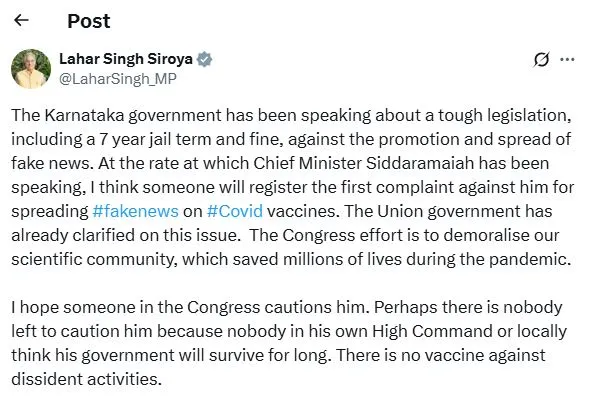 लहर सिंह सिरोया ने सिद्दरामय्या पर कोविड-19 टीकों के बारे में फर्जी खबरें फैलाने का आरोप लगाया