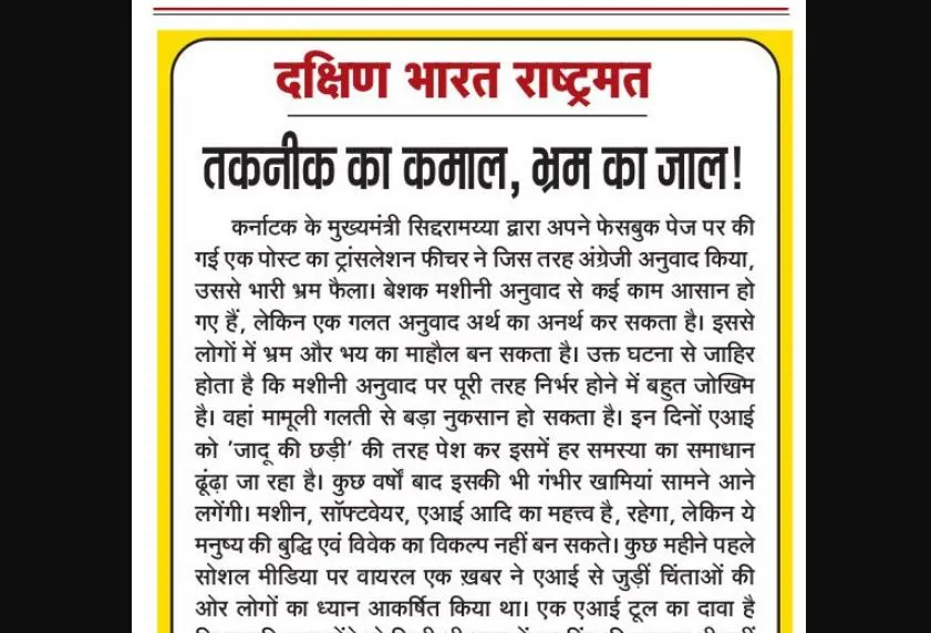 कर्नाटक के मुख्यमंत्री सिद्दरामय्या द्वारा अपने फेसबुक पेज पर की गई एक पोस्ट का ट्रांसलेशन फीचर ने जिस तरह अंग्रेजी अनुवाद किया, उससे भारी भ्रम फैला। बेशक मशीनी अनुवाद से कई काम आसान हो गए हैं, लेकिन एक गलत अनुवाद अर्थ का अनर्थ कर सकता है। इससे लोगों में भ्रम और भय का माहौल बन सकता है। उक्त घटना से जाहिर होता है कि मशीनी अनुवाद पर पूरी तरह निर्भर होने में बहुत जोखिम है। वहां मामूली गलती से बड़ा नुकसान हो सकता है। इन दिनों एआई को 'जादू की छड़ी' की तरह पेश कर इसमें हर समस्या का समाधान ढूंढ़ा जा रहा है। कुछ वर्षों बाद इसकी भी गंभीर खामियां सामने आने लगेंगी। मशीन, सॉफ्टवेयर, एआई आदि का महत्त्व है, रहेगा, लेकिन ये मनुष्य की बुद्धि एवं विवेक का विकल्प नहीं बन सकते। कुछ महीने पहले सोशल मीडिया पर वायरल एक ख़बर ने एआई से जुड़ीं चिंताओं की ओर लोगों का ध्यान आकर्षित किया था। एक एआई टूल का दावा है कि उसकी मदद लेंगे तो किसी भी भाषा में टाइपिंग की जरूरत ही नहीं रहेगी। आप बोलते जाएं, वह हू-ब-हू टाइप कर देगा। उसकी मदद से एक व्यक्ति ने किसी धार्मिक कार्यक्रम की ख़बर लिखी और कई ऑनलाइन प्लेटफॉर्म पर पोस्ट कर दी। उसने एआई टूल पर आंखें मूंदकर भरोसा किया था। जब वह ख़बर लोगों तक पहुंची तो भारी हंगामा हो गया, क्योंकि एआई टूल ने दो-तीन जगह घोर आपत्तिजनक एवं अभद्र शब्द लिख दिए थे। दरअसल वह व्यक्ति कुछ शब्दों का सही उच्चारण नहीं करता था। उसने अपनी तरफ से जो शब्द बोले, उन्हें सही समझा। एआई टूल ने उनका अपनी मर्जी से मतलब निकाला और वही टाइप कर दिया। उस व्यक्ति को न तो भाषा का पर्याप्त ज्ञान था और न उसने कभी यह सोचा होगा कि एआई टूल गलती कर सकता है। संबंधित कंपनी इसे तकनीकी गड़बड़ बताकर पल्ला झाड़ सकती है। वहीं, ऐसी घटनाएं हिंसा और उपद्रव की वजह बन सकती हैं।